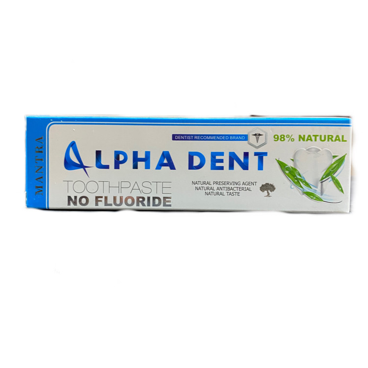 خمیردندان مانترا آلفادنت خمیردندانی بدون فلوراید است. این خمیردندان قدرت تمیزکنندگی بالایی داشته و به طور موثری آلودگی و بقایای مواد غذایی را از روی دندانها پاک میکند. همچنین در این محصول از ترکیبات مفیدی همچون آلفاپاینن استفاده شده است که به سفید شدن و جلوگیری از پوسیدگی دندان کمک میکند همیشه از ترکیب فلوراید و آب به عنوان یک ماده موثر در جلوگیری از پوسیدگی دندانها استفاده می شده است، اما در سالهای اخیر شیوع بیماری فلویٔوروزیس که به علت مصرف زیاد فلوراید ایجاد میشود، به صورت لکه هایی برروی دندان ظاهر و به ساختمان دندان صدمه میزند، باعث شده است که طرفداران استفاده از خمیردندان بدون فلوراید روز به روز افزایش یابند.